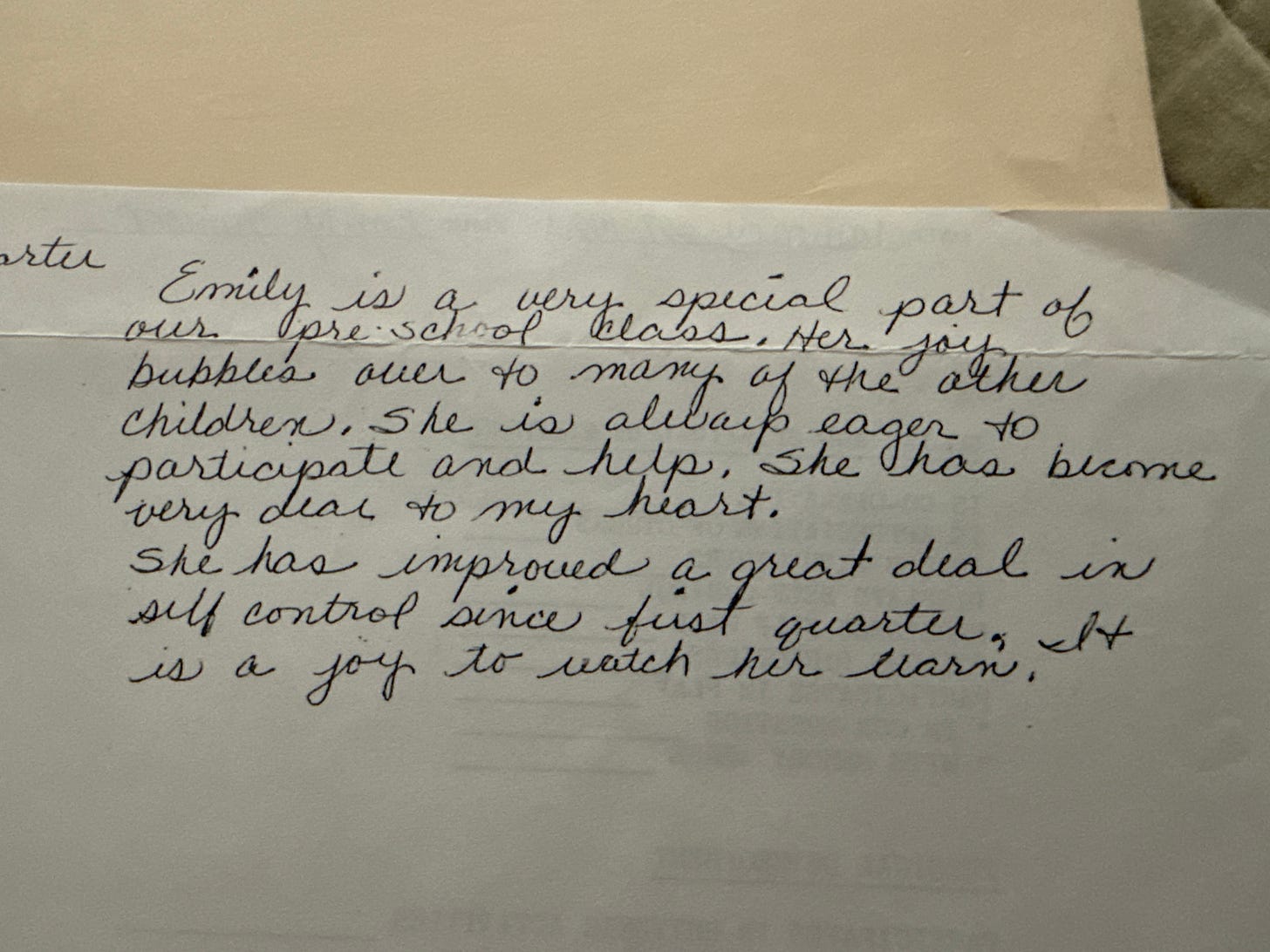 I opened the folder and spent an hour with my jarring history of perfectionism - working my way back from high school to 4 year-old Emily’s preschool evaluation.