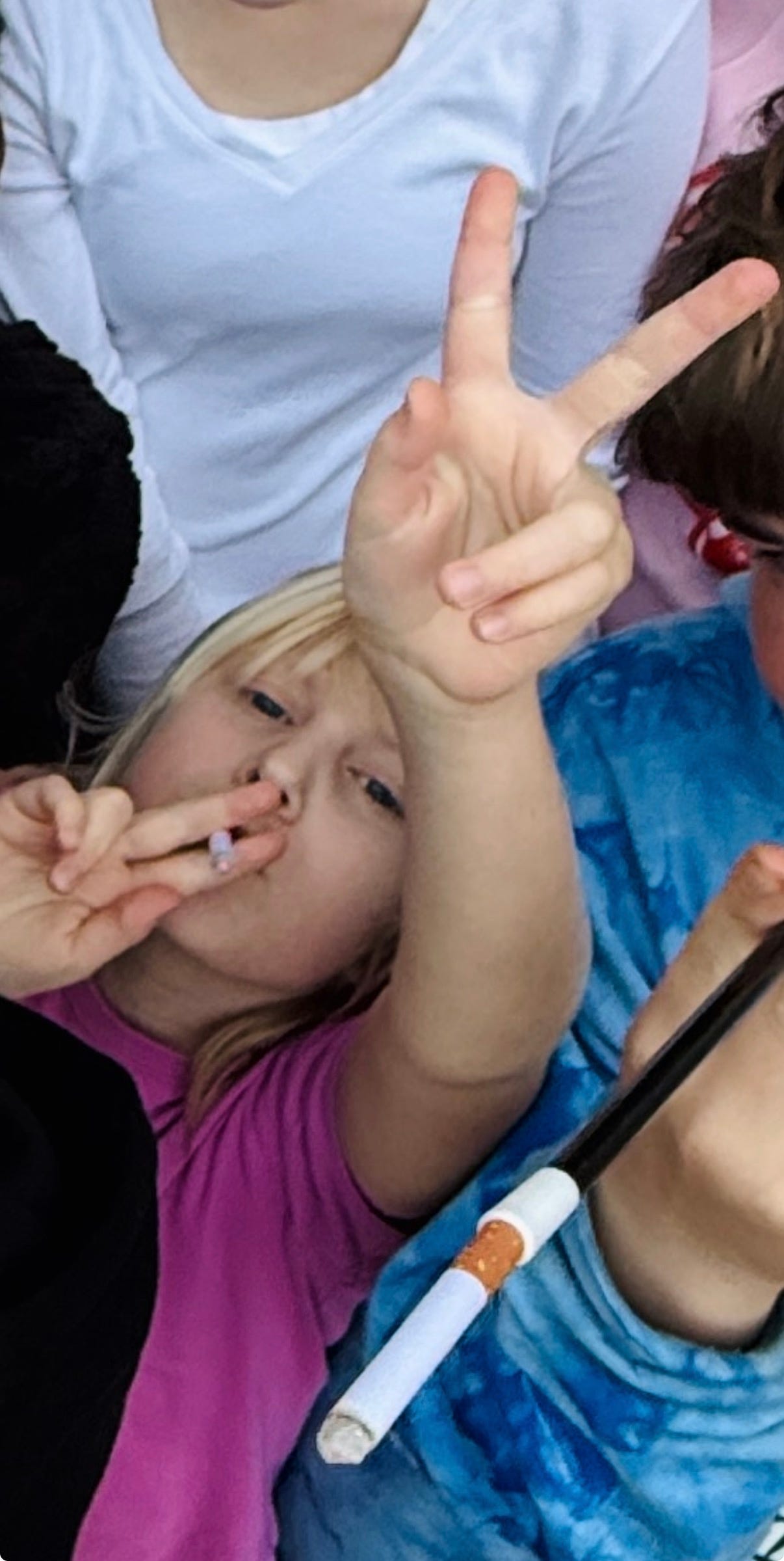 (The cigarettes are prop cigs. Entirely fake. I exhorted all of the children to never smoke, I illuminated the perils of smoking. But yes, we did play with them.)